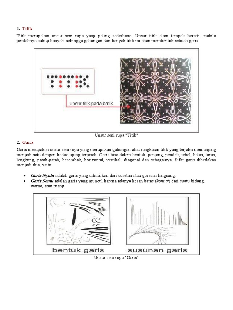 Dari titik kita dapat membuat garis, dari garis membentuk bidang, kumpulan bidang akan menghasilkan volume. Bidang mempunyai dimensi panjang dan lebar. Ada banyak unsur pembentuk karya seni rupa diantaranya titik, garis, bidang, volume, warna, tekstur dan gelap terang. Unsur seni rupa yang paling sederhana adalah. Dalam seni rupa, terdapat satu unsur yang paling sederhana yaitu titik. Jadi jangan anggap remeh suatu seni, karena dunia tidak akan berwarna tanpa seni. Unsur ini terbentuk dari beberapa garis yang menjadi satu kesatuan. Titik merupakan unsur seni rupa yang paling sederhana. Dari sebuah titik, bisa terlahir sebuah garis, bidang, bahkan bentuk. Bentuk merupakan unsur yang membuat sebuah seni rupa menjadi lebih hidup dan bisa diamati sebagai karya seni yang utuh dan bentuk terdiri dari beberapa bidang. Unsur titik akan tampak berarti apabila jumlahnya cukup banyak, sehingga gabungan dari. Unsur yang satu ini juga hanya berada pada satu dimensi saja. Hingga saat ini, karya seni rupa masih banyak diminati karena hasilnya yang seperti objek nyata.